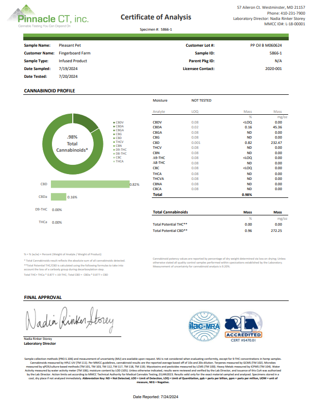 Experience the pure essence of nature with The Pleasant Pet Hemp Oil. Our organic, broad-spectrum CBD is lovingly cultivated in Maryland without the use of pesticides or herbicides. Each 1 fl. oz (30 mL) bottle is produced with care by Fingerboard Farm in Ijamsville, MD.